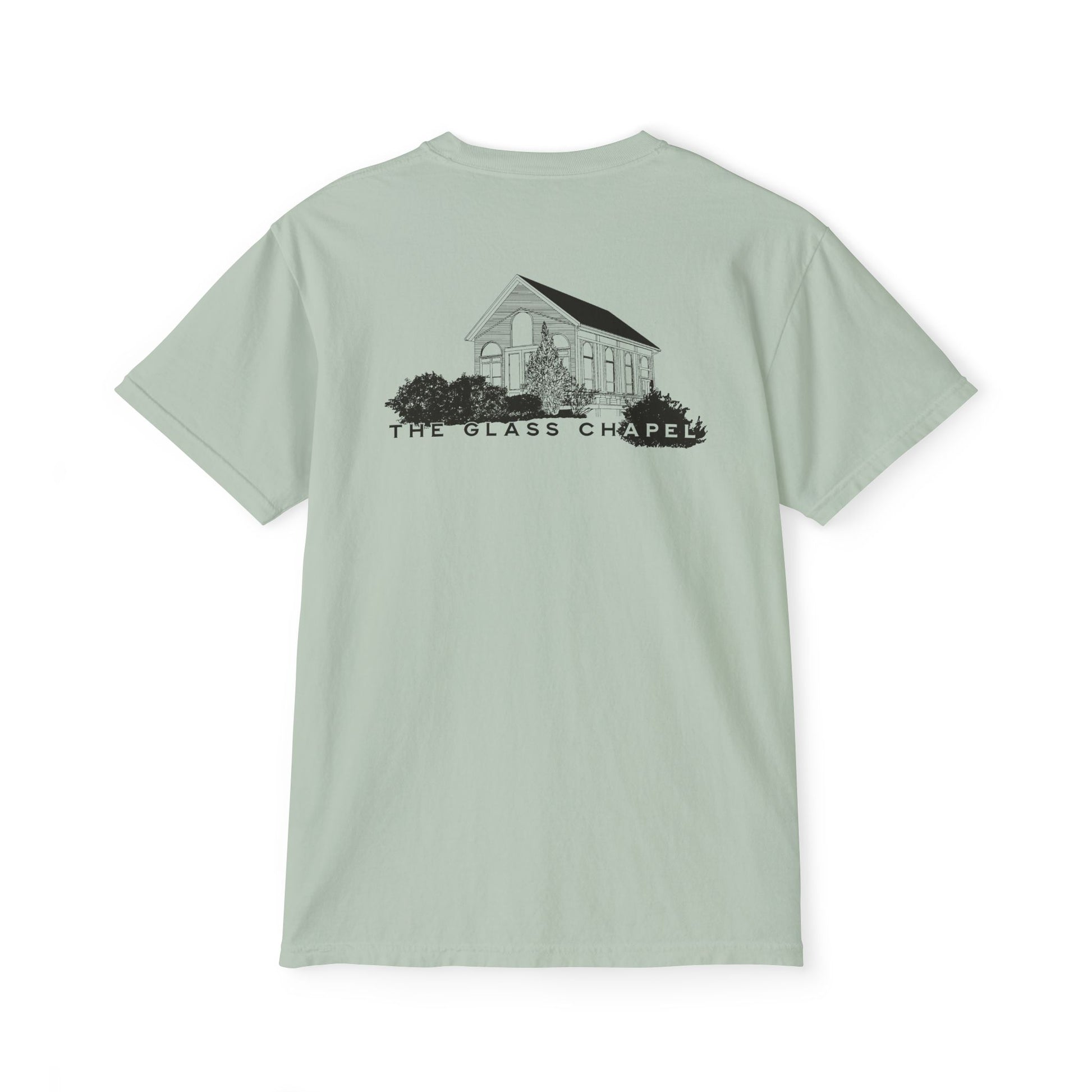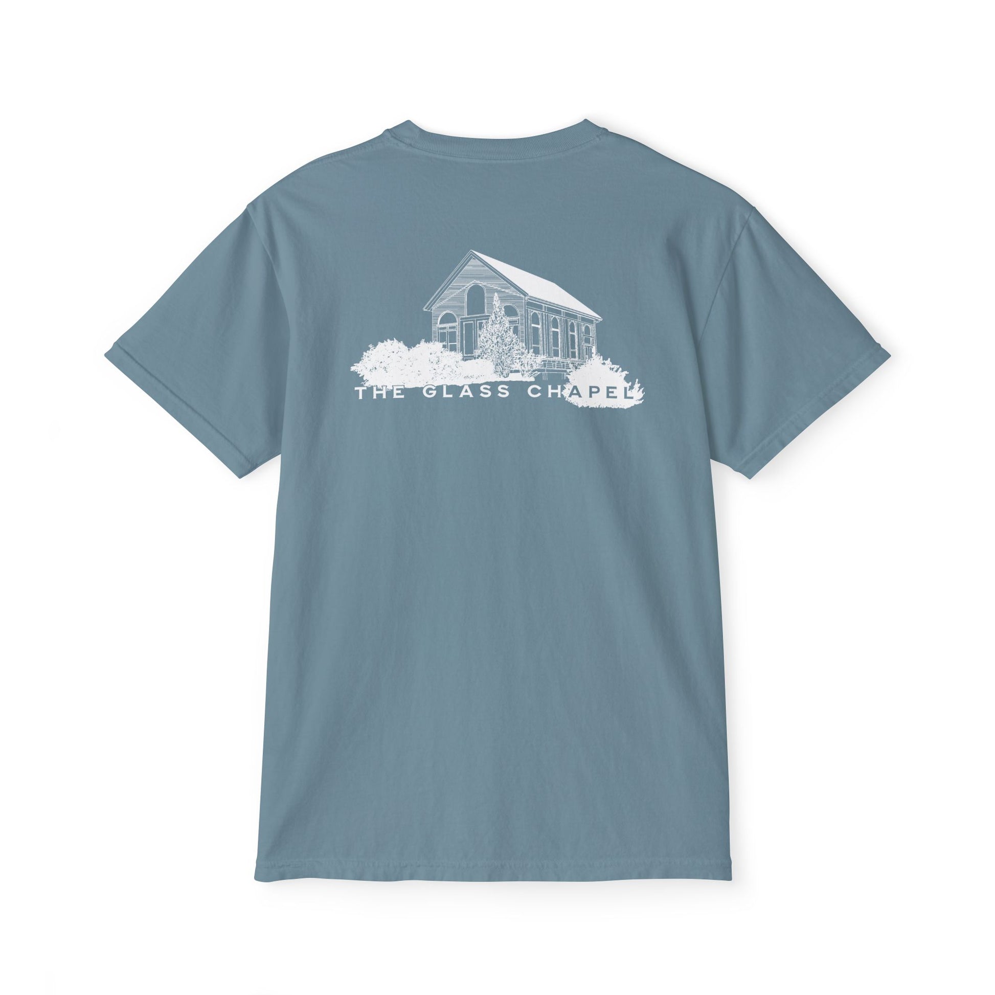 A classic Comfort Colors pocket tee with the soft, broken-in feel of a long-time favorite. The front pocket features a simple Glass Chapel logo, while the back showcases the full chapel illustration — clean, timeless, and rooted in the quiet charm of the property. Garment-dyed color gives it that washed-in, vintage tone from day one, and the relaxed fit makes it an easy layer for wedding weekends, rehearsals, or everyday life long after the celebration.