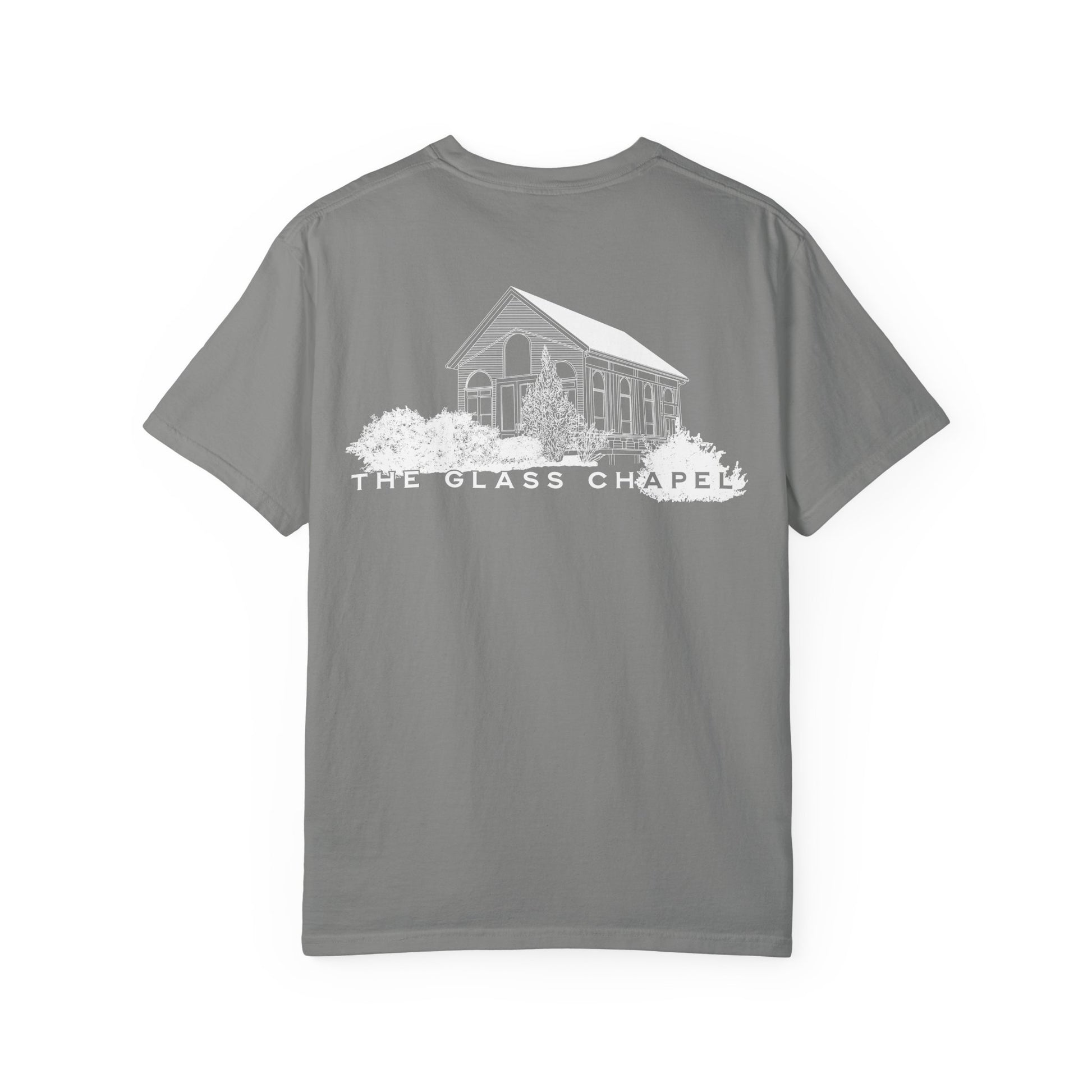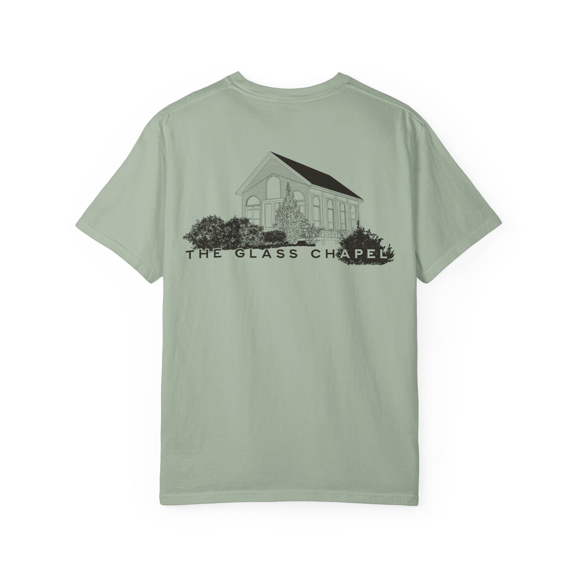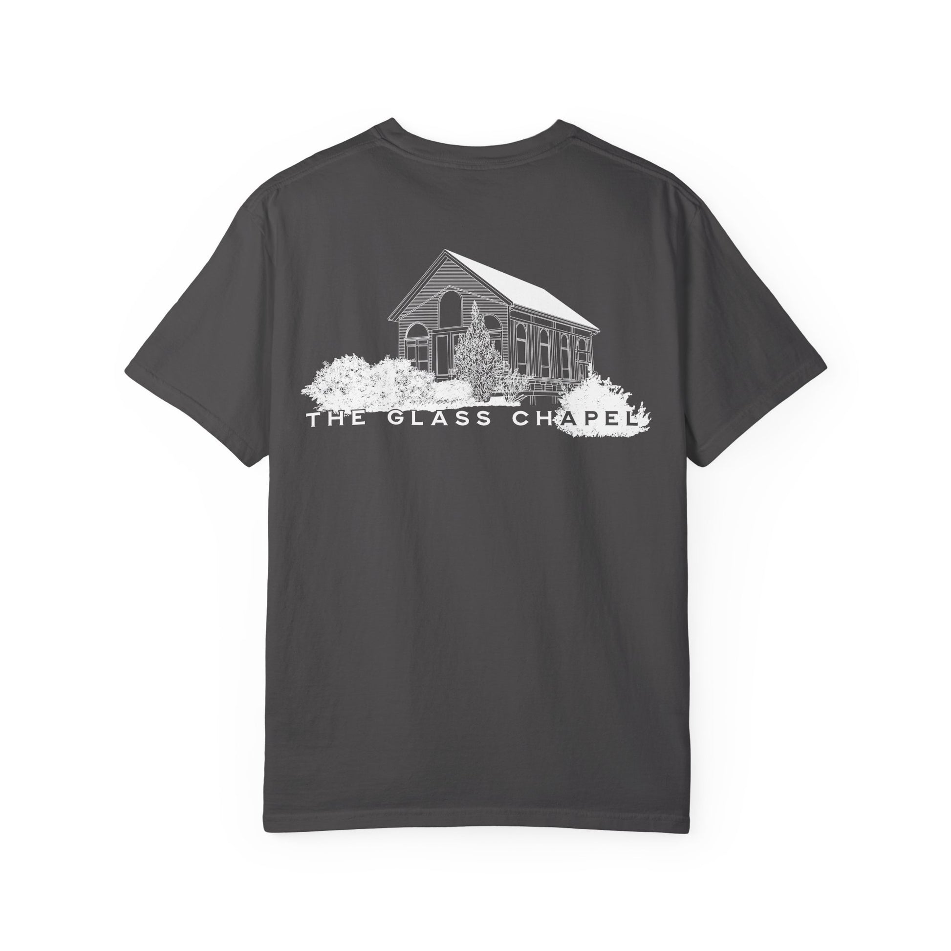 Front left-chest “The Glass Chapel” logo; full chapel illustration on back