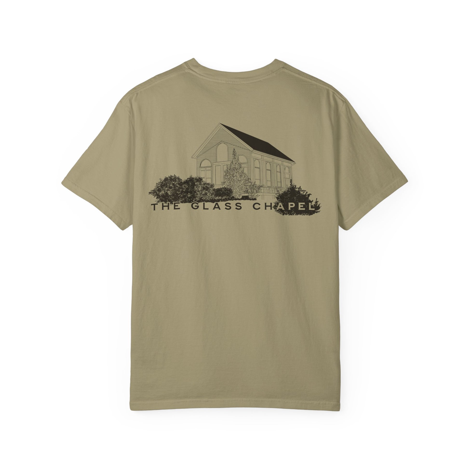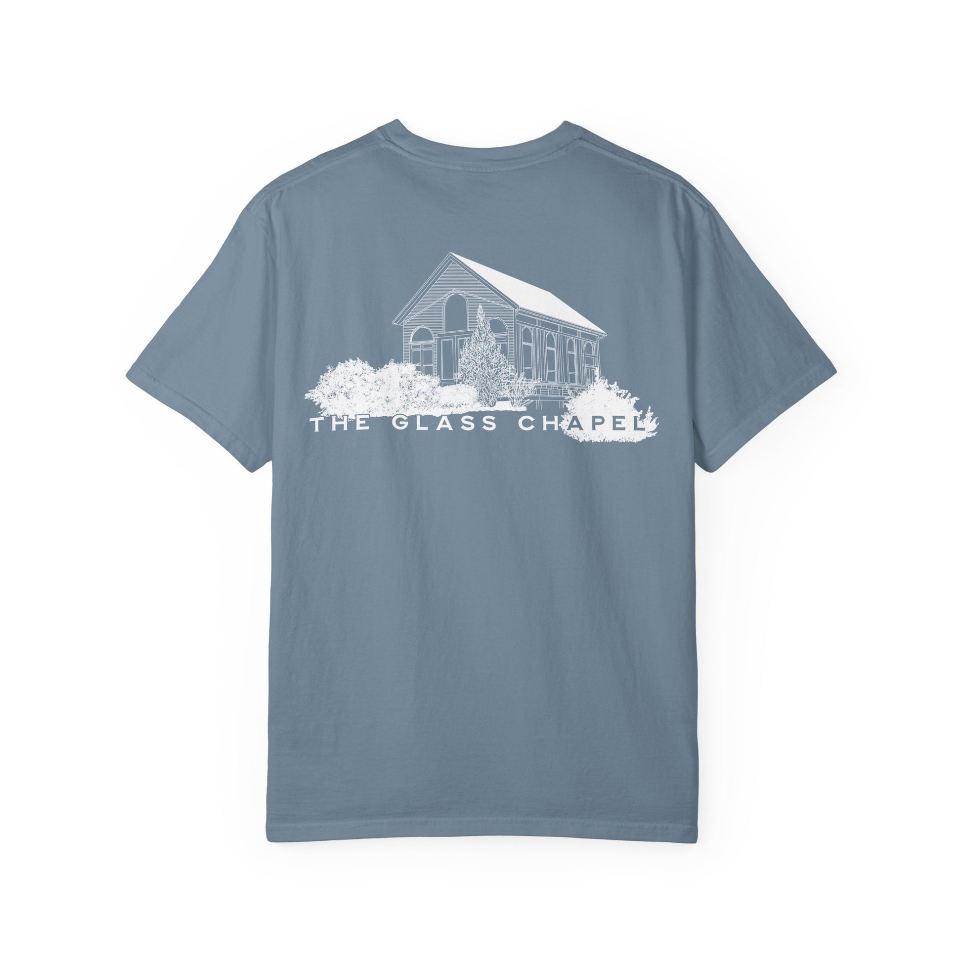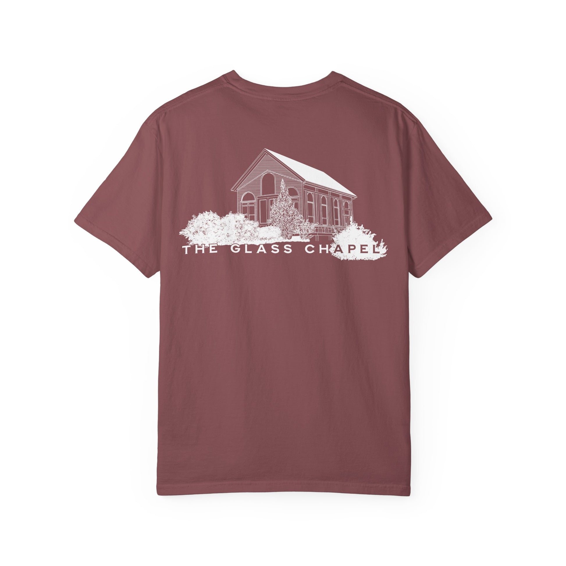 Front left-chest “The Glass Chapel” logo; full chapel illustration on back