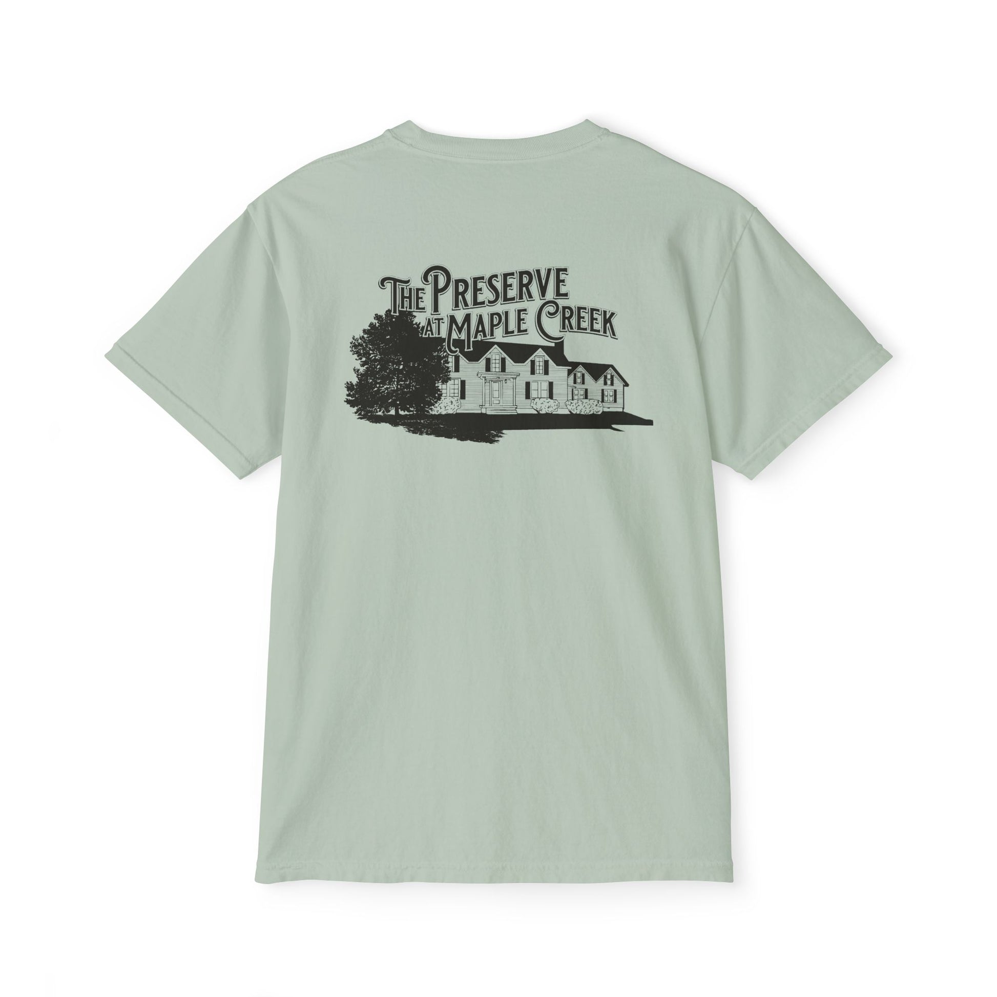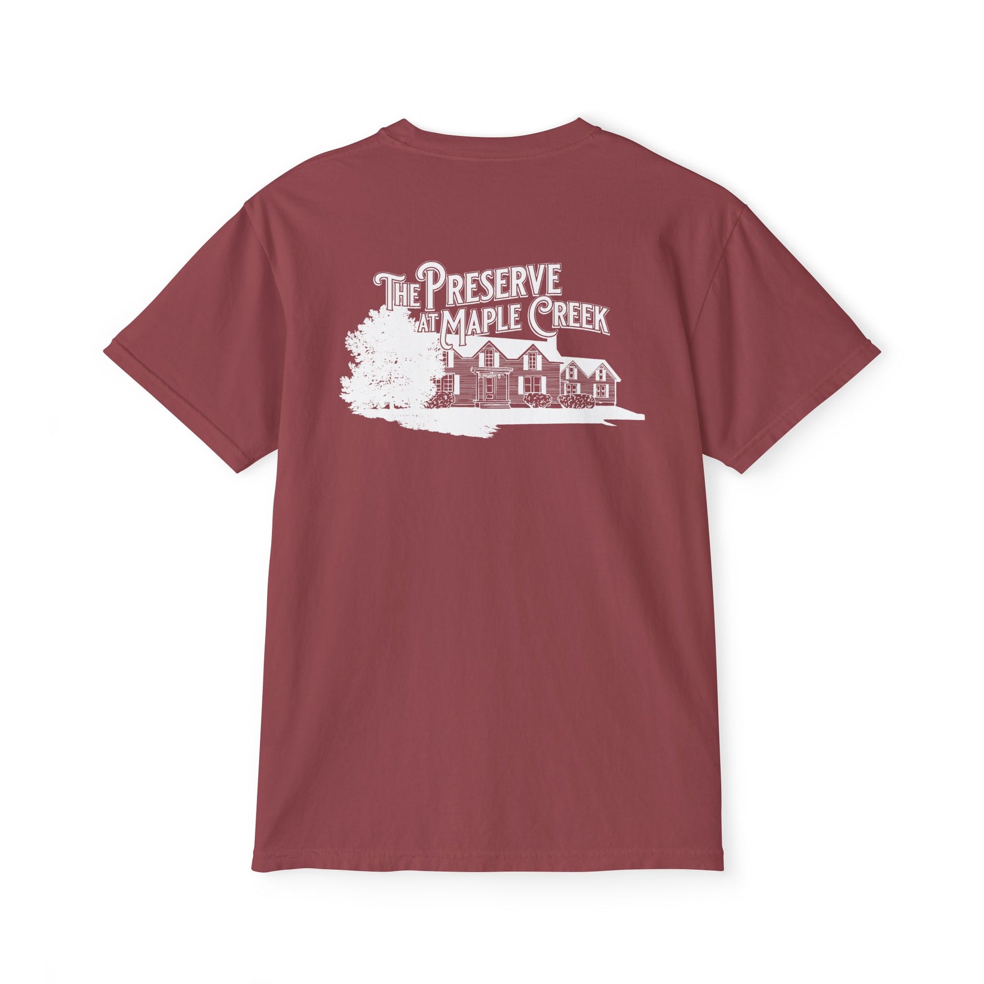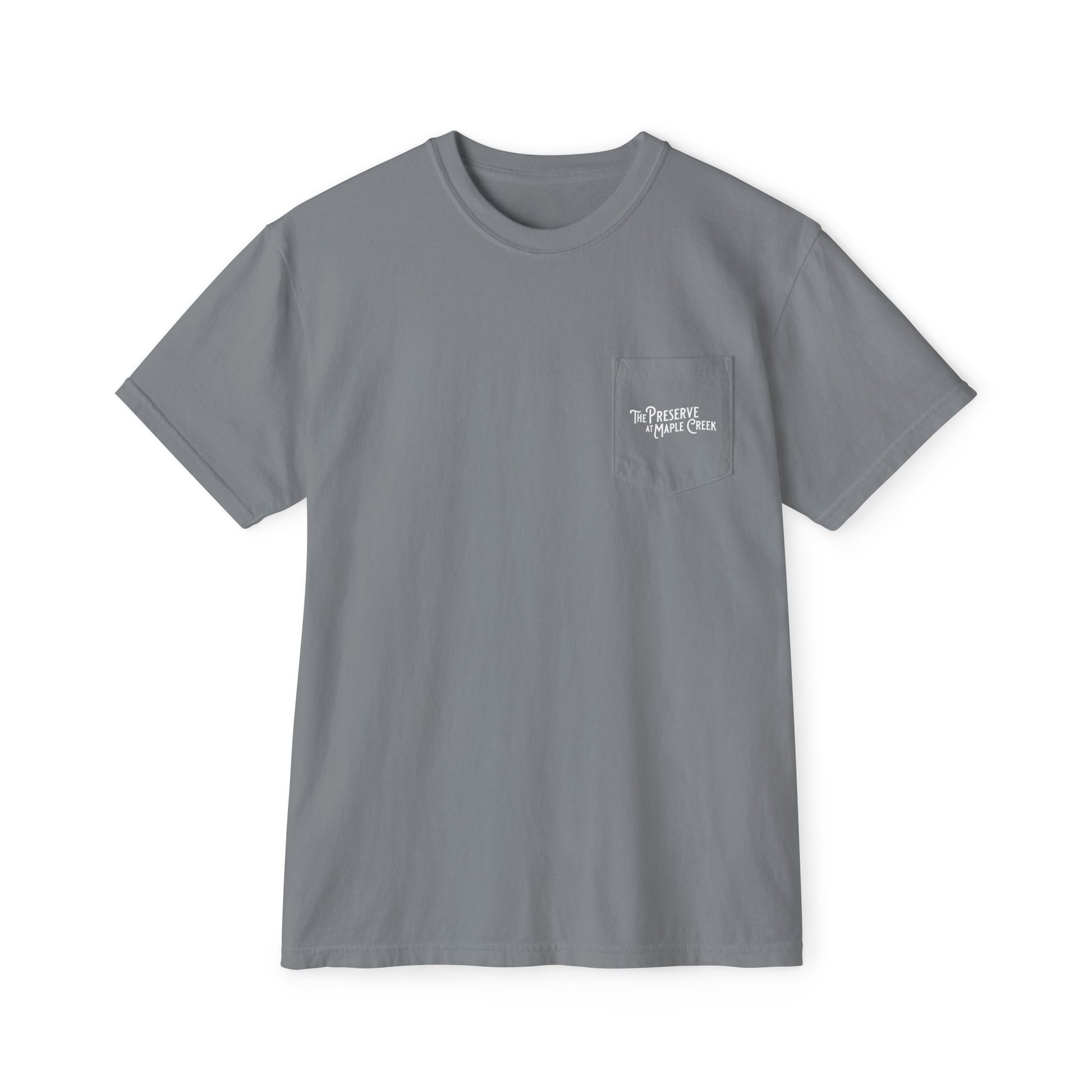 A classic pocket tee with the soft, lived-in feel Comfort Colors is known for. The front pocket carries a subtle Preserve at Maple Creek logo, while the back features the full illustrated lodge and tree line — a nod to slow mornings, familiar paths, and the quiet beauty of the property.
